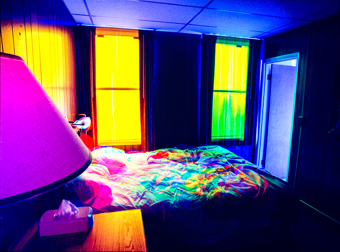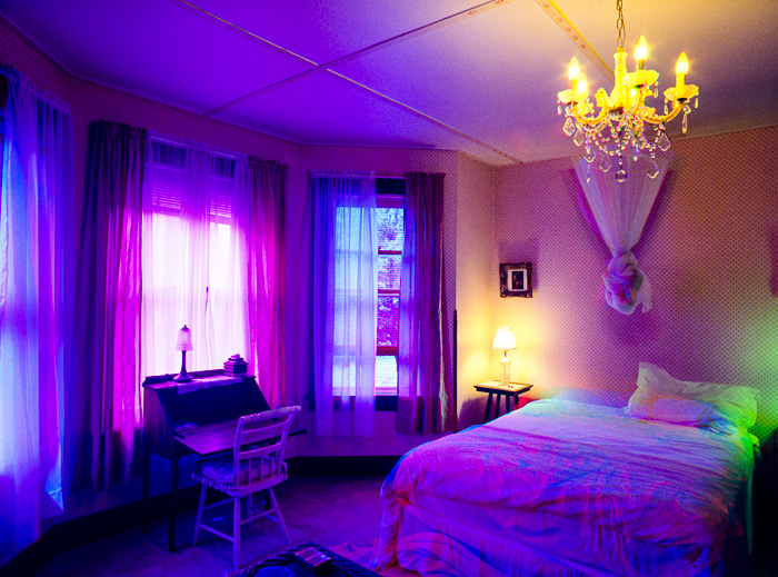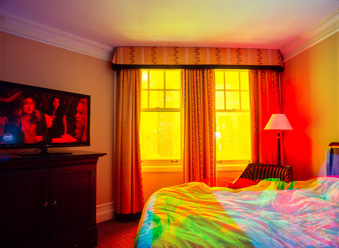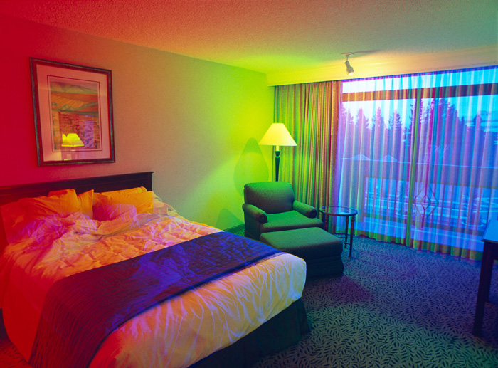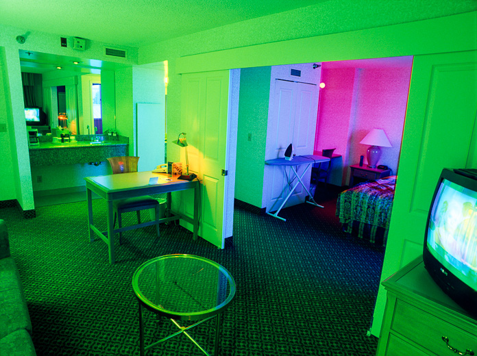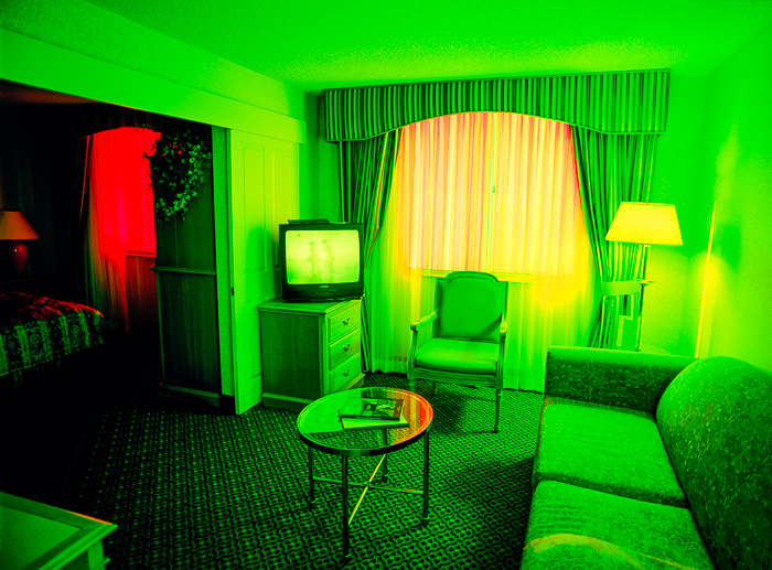 La serie tiene soporte conceptual. Tengo reglas que combinan los elementos del azar en estos ambientes con reglas predeterminadas que proveen parámetros subyacentes para este proceso, Uso una técnica intensiva en tiempo que captura la evolución de la luz y enfatiza el cambio en colores vívidos. Se toman exposiciones múltiples en el curso de 2 o más días y las imágenes son creadas en la cámara on en la película fotográfica sin manipulación digital. Cada imagen está compuesta de 3 a 9 exposiciones. Sólo se utiliza la luz de la habitación para crear las imágenes – no se usan bombillas coloreadas ni geles. Fotografío nada más a horas pre-determinadas del día, y no me permito esperar a que exista la iluminación perfecta; debo ajustarme a una iluminación en particular dadas las restricciones de estos horarios.