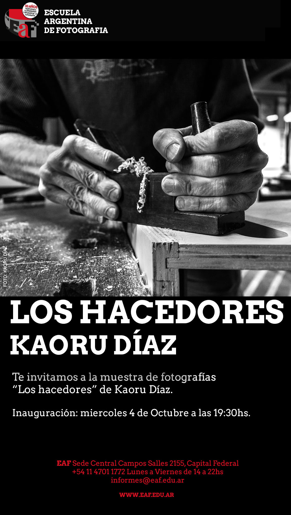 Tenemos el agrado de invitarlos a la inauguración de la exposición "Los hacedores" de Kaoru Díaz. El día 4 de Octubre a las 19:30hs en la galería Alicia D´Amico, Escuela Argentina de Fotografía, ubicada en Campos Salles 2155, Nuñez.